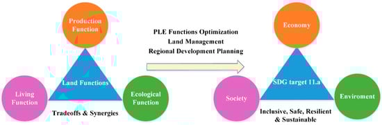 Our study provided a new idea that links the PLE functions coordination with SDG target 11.a. The study of coordinated degree of PLE functions can contribute to the achievement of SDG 1.1.a, which offer useful support for decision makers. In order to achieve SDG target 11.a, on the one hand, decision makers can refer to the coordination degree of PLE functions before planning. On the other hand, decision makers can also use the coordination degree of PLE functions to evaluate the effect of planning implementation afterwards. Although the coordination of PLE functions does not directly calculate the value of SDG target 11.a, their characteristics can reflect a realization of SDG target 11.a (Table 1), helping to reduce the vagueness of SDG target 11.a [,]. Our research can help decision makers better understand the coordination of PLE functions and provide them with useful knowledge for SDG target 11.a. Furthermore, research on typical areas of China was carried out by this study according to the international science program of SDGs, the methodology and analytical framework could be easily applied worldwide for supporting the SDG target 11.a and promoting land planning as well as management. This is of great significance for regional development planning and sustainable development in China and is also referential for other countries.