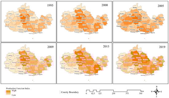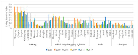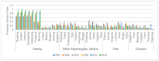 Considering the temporal changes from 1995 to 2019, the production function of Nanning city showed a continuous upward trend, whereas that of the other prefecture-level cities fluctuated up and then down (Figure 3). From 1995 to 2000, the production functions of the six cities in the study area showed an upward trend with gentle growth. From 2000 to 2009, due to the impact of the external economy, the production function of the cities other than Nanning city declined, whereas that of Nanning city showed gentle growth, which indicated the high stability of its production function. From 2009 to 2019, with the exception of Nanning city, whose production function showed gentle growth, the production function of the other cities tended to be stable. This indicates that, as the requirements for high-quality development increased during the 12th and 13th Five-Year Plan periods, as more energy-consuming industries transformed, their industrial functions were not demonstrated any further. Nanning city’s industrial development was mainly based on new industries, such as research technology; thus, its production function continued to grow.