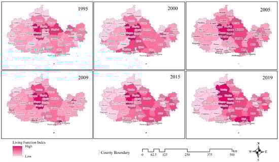 Living function evaluation results in the Guangxi Beibu Gulf urban agglomeration from 1995 to 2019.