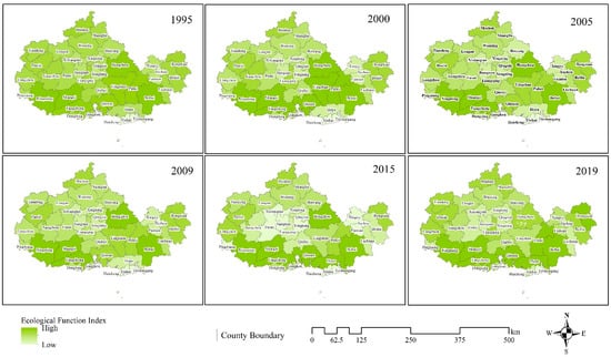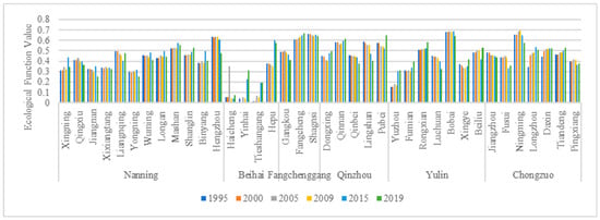Ecological function evaluation results in the Guangxi Beibu Gulf urban agglomeration from 1995 to 2019.