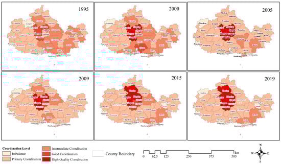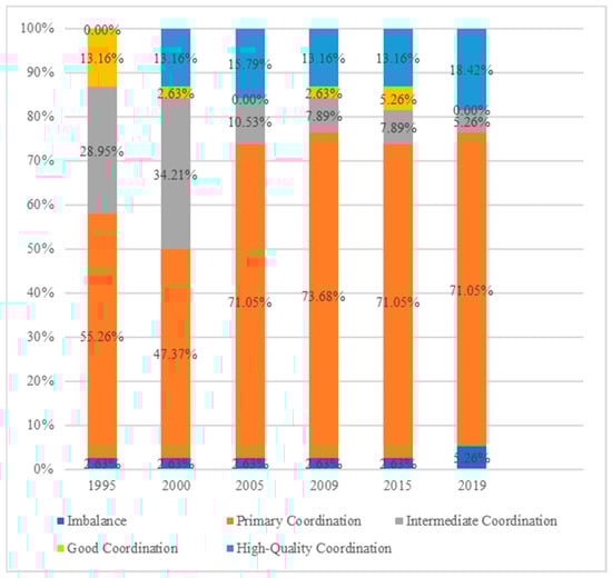 Drawing on the literature [,,,,] and the equal interval method, five coordination levels for the study area were identified: imbalance, primary coordination, intermediate coordination, good coordination, and high-quality coordination. The results of the coupling and coordination levels of the study area for the six periods from 1995 to 2019 were obtained (Figure 9).