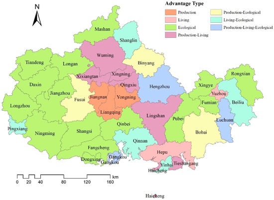 Distribution of land function advantage areas in the Guangxi Beibu Gulf urban agglomeration.