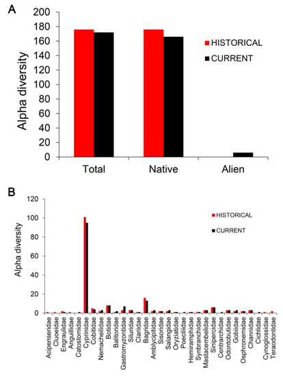 Alpha diversity (# of species) according to origin (A) and family (B) in the Gan River Basin for the historical (red) and current (black) time periods.