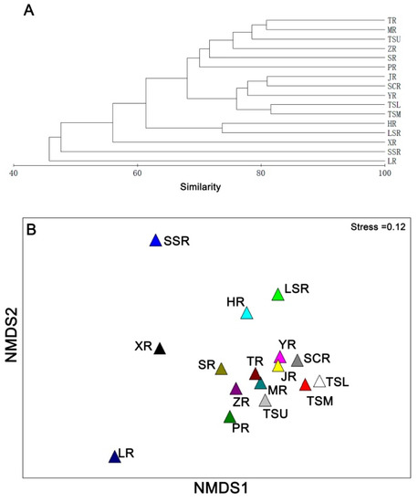 Dendrogram from a hierarchical cluster analysis of species composition (A) and non-metric multidimensional scaling (NMDS) ordination (B) of community composition in the Gan River Basin for the current period. River codes are the same as in Table 1.