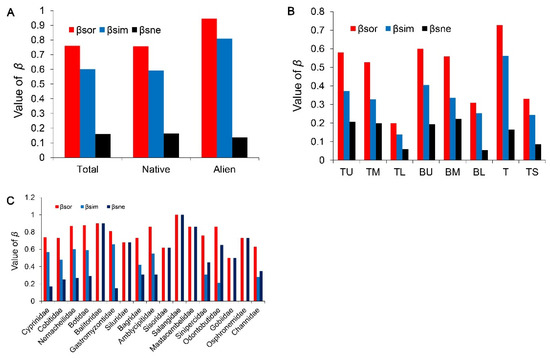 Beta diversity according to origin (A), basins of the Gan River Basin (B), and families (C) quantified by the Sørensen index (βsor) and its species spatial turnover (βsim) and nestedness components (βsne) in the current period. River codes are the same as in Table 1.