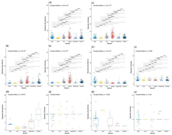 Species’ richness and abundance of all fungal sporocarps (A,a), soil fungal sporocarps (B,b), rotten-wood fungal sporocarps (C,c), litterfall fungal sporocarps (D,d), and living-tree fungal sporocarps (E,e) in 6 months, as demonstrated by a boxplot diagram. The different colored boxplots represent the species’ richness or abundance of the fungal sporophores in 6 months.