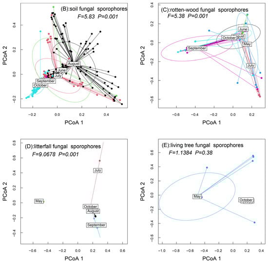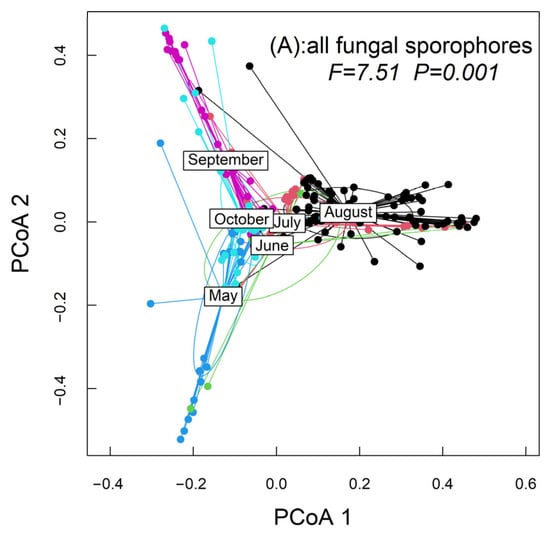 Effect of months on beta diversity of the fungal sporocarps by PCoA. PERMANOVA was applied to test how these distances differed among months. Capital “F” refers to F values, and capital “P” refers to p values. PCoA1 and PCoA2 are the first and second sort axes in the “PERMANOVA” analysis, respectively.