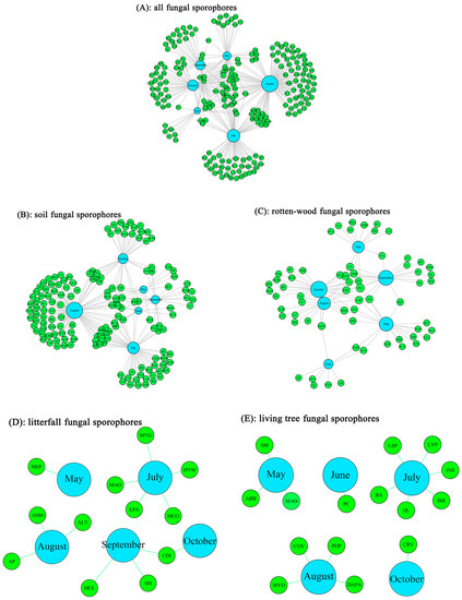 A fungal sporocarps–month network graph was used to visualize the strong potential relationships between fungal sporophores and months. The structure of the sporophore–month network was evaluated using the H2′ metric of specialization and connectance index [31]. The architecture of the sporophore–month network was visualized using the “bipartite” package of R software [32].