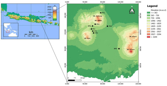 The study was conducted in Sumatran pine forests, East Java, Indonesia (Figure 1). We analyzed four pine forest types, including the protected pine forest (PF), the non-tapped pine forest (NP), the tapped-pine forest (TP), and the pine forest-based agroforestry (PA), please see from Figure 2. The PFs in this study are very homogenous, with an understory of grasses and shrubs that lack proper management, such as thinning and pruning. The NPs are also very homogenous, with an understory of grasses. Intensive sap-tapping activities are carried out once every three days in the TPs. At the same time, PAs are cultivated with various vegetable crops such as cabbage and intensive pesticide application.