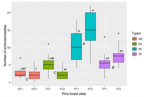 Difference of the ambrosia beetle’s population between the pine forest types or sites in East Java, Indonesia. PA = pine forest-based agroforestry, NP = non-tapped pine forest, PF = protected pine forest, TP = tapped-pine forest. Boxplots with different capital and small letters were significantly different between the pine forest types and sites at p < 0.05, according to Tukey HSD. Bars represent the interquartile range with the median value. Circles indicate outliers. Vertical solid lines indicate minimum and maximum values.