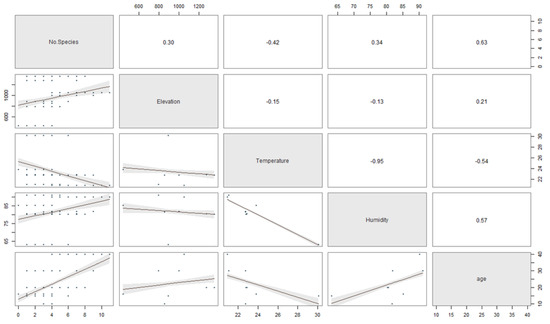 The scatter plot matrix describes the multiple regression between the stand-age, elevation, temperature, and humidity to the number of ambrosia beetle species.