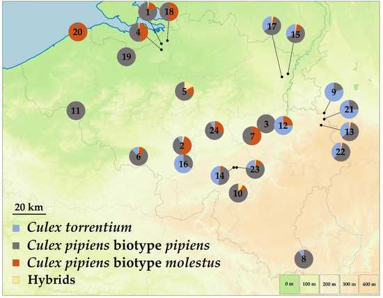 Distribution of Culex specimens identified using DNA-based techniques and collected during the MEMO survey 2017–2019 [11]. Hybrids = Cx. pipiens biotype pipiens X Cx. pipiens biotype molestus. The numbers indicated on the pie charts are the collection site numbers used in Table S3.