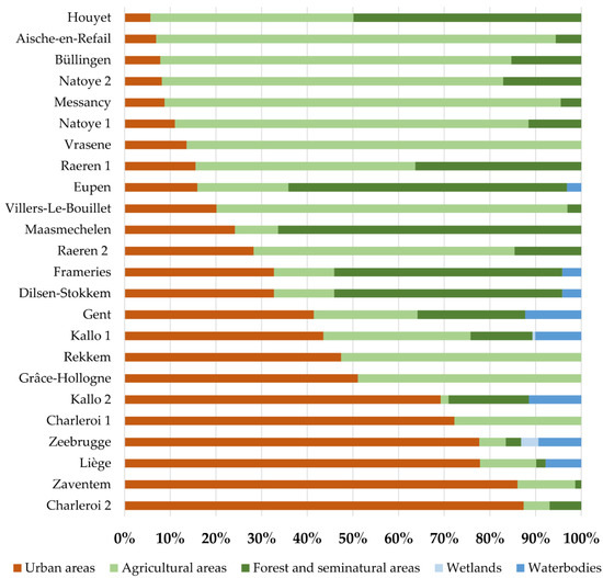 The percentage of main Corine Land-Cover classes in a 2.5 km buffer zone around the sampling locations (group levels based on five classes).