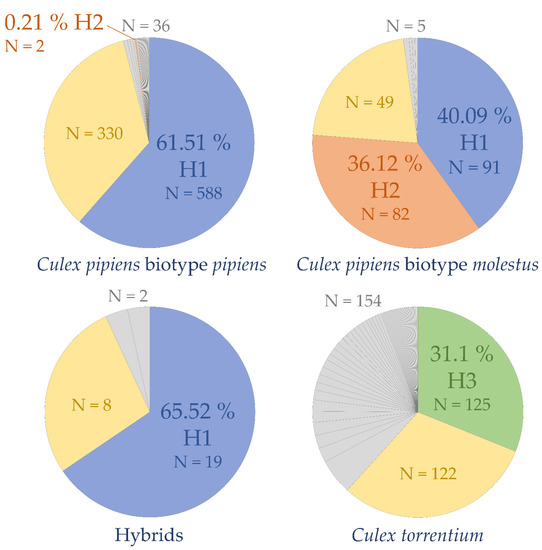 The most common COI haplotypes in Cx. pipiens s.s. were H1 (698 out of 1248 sequences, including 19 hybrids, 91 Cx. pipiens biotype molestus, and 588 Cx. pipiens biotype pipiens) and H2 (84 out of 1248 sequences, including 82 Cx. pipiens biotype molestus and 2 Cx. pipiens biotype pipiens) (Figure 3). The most common COI haplotype in Cx. torrentium was H3 (125 out of 401 sequences) (Figure 3). The haplotype of 509 sequences could not be identified because of ambiguous sites or short fragment lengths (NCx. torrentium = 122; NCx. pipiens biotype pipiens = 330; NCx. pipiens biotype molestus = 49; Nhybrids = 8).