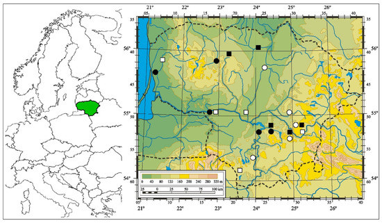 Location of the Cornus seed bank sampling sites in Lithuania. White dots—C. alba; black dots—C. sericea; black squares—C. sanguinea subsp. australis; white squares—C. sanguinea subsp. sanguinea.