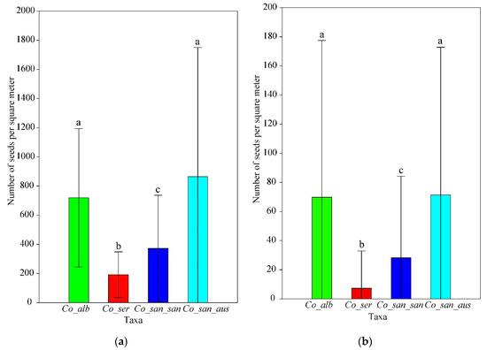 Mean number of the intact Cornus seeds per square metre: (a)—upper layer (0–5 cm); (b)—lower layer (5–10 cm). Whiskers indicate standard deviation. Different letters above the whiskers indicate significant differences (p < 0.05) applying Dunn’s z-test. Abbreviations of taxa: Co_alb—Cornus alba; Co_ser—Cornus sericea; Co_san_san—Cornus sanguinea subsp. sanguinea; Co_san_aus—Cornus sanguinea subsp. australis.