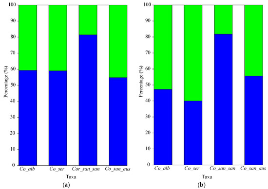 Ratio of viable (green) and non-viable (blue) seeds in different soil layers. (a)—in the upper layer; (b)—in the lower layer. Abbreviations of taxa: Co_alb—Cornus alba; Co_ser—Cornus sericea; Co_san_san—Cornus sanguinea subsp. sanguinea; Co_san_aus—Cornus sanguinea subsp. australis.