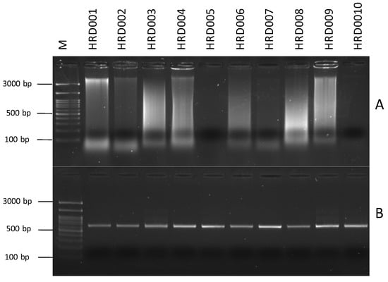 Total genomic DNA was isolated from 107 out of the 117 powder samples. The ten samples in which the DNA isolation failed were from Kottai karanthai (HRD023), Lavangappattai (HRD062), Koraikizhangu (HRD065), Boomi sakkarai kilangu (HRD066), Maathulai (HRD074), Kadukkai (HRD083), Aduthinnaipalai (HRD089), Thanrikkai (HRD117), Naval (HRD139), and Poonnankanni (HRD142). Incubation of the powders in the DNA extraction buffer overnight at room temperature was essential for better extraction of genomic DNA. In general, compared with the powders from leaves and flowers, the powders from root, rhizome, stem, and bark yielded much less DNA. However, the quantity of DNA obtained was more than sufficient to PCR amplify the DNA barcode markers. Often 10 to 30 times dilution of the DNA gives better results in terms of PCR amplification, likely due to dilution of the co-precipitated PCR inhibitors [31]. We obtained a 100% success rate for PCR amplification and sequencing of the rbcL marker. Therefore, we subjected all of the 107 samples for authentication. As per the label, these samples were derived from 65 species, which belong to 60 genera and 35 families. Agarose gel electrophoresis of DNA and rbcL marker amplified from ten samples are given in Figure 1. The chromatograms of the rbcL sequences were manually edited before using the data for further analysis.