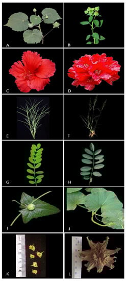 - Poovitha, S.; Stalin, N.; Balaji, R.; Parani, M. Multi-locus DNA barcoding identifies matK as a suitable marker for species identification in Hibiscus L. Genome 2016, 59, 1150–1156. [Google Scholar] [CrossRef] [PubMed] [Green Version]