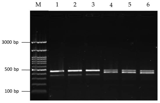 Agarose gel electrophoresis of PCR amplified trnH-psbA DNA barcode markers from the two mixed samples of Tulsi, TUL008 (lanes 1–3) and TUL015 (lanes 4–6), along with 100 bp DNA ladder (M).