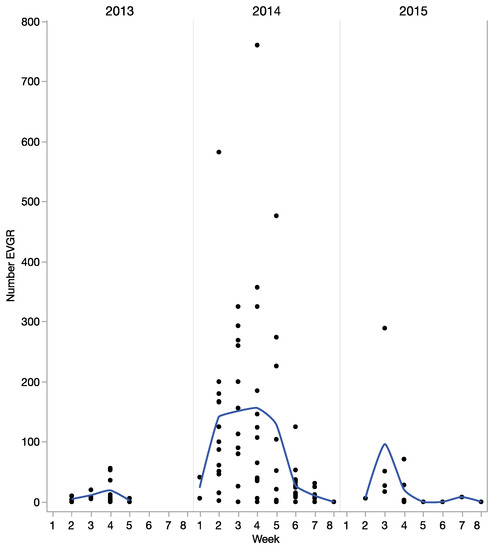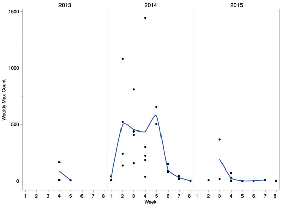 Maximum daily counts aggregated by week, 2013–2015, on the campus of Oregon State University, Corvallis, Oregon USA. Counts of zero are not illustrated (see Figure 1). Lines are Savitzky–Golay-fitted means [14] implemented with JMP [15].