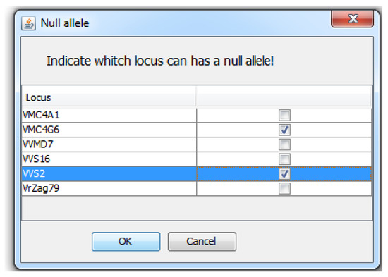 Summary statistics, including allele frequencies, H, and PIC can be displayed or also saved under ‘Display/Summary Statistics’ or ‘Save/Summary Statistics’. Before the allele frequencies are displayed, it is necessary to indicate in which loci a null allele is possible (Figure 3). For example, a screenshot of the summary statistics display is shown in Figure 4.