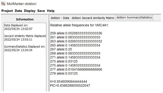 The development of restriction fragment length polymorphism (RFLP) for linkage mapping in humans by Botstein et al. [5] not only created the possibility for the development of other classical methods, such as random amplified polymorphic DNA (RAPD) and amplified fragment length polymorphism (AFLP), but also pinpointed the measures of an ideal marker by describing polymorphic information content (PIC). The reliability of marker selection depends mainly on the strength of linkage between the marker and the genomic region of interest. For the accurate design of genetic studies, such estimates must be calculated to describe the informativeness of the markers. However, there are currently no easily accessible calculators for that purpose. To simplify the work of molecular studies, we previously developed a useful online tool PICcalc [6] for the calculation of heterozygosity (H) [7] and PIC. These two values were adjusted for both dominant and co-dominant markers (both binary and allelic data) to measure the quality or informativeness of the polymorphism of the genetic marker. Currently, PICcalc is the only accessible program that can easily calculate these values for genetic studies in various organisms [8,9,10]. Due to the popularity and high demand for PICcalc web, we sought to develop a downloadable version with additional features that could operate independently of continuous server maintenance procedures. In addition, MolMarker has an easy-to-learn user-friendly graphical user interface (GUI). Java was used as a programing language, which provides platform independence. The software consists of a core application and joint plugins, which makes the software suitable for built-in new algorithms. The core application is responsible for the service and display of the GUI, the projects, and the data, as well as for some simple computations. The plugins carry out the following operations: PIC and H calculation, database editing, construction of dendrograms, calculation of parent-offspring relations, and null allele estimation.