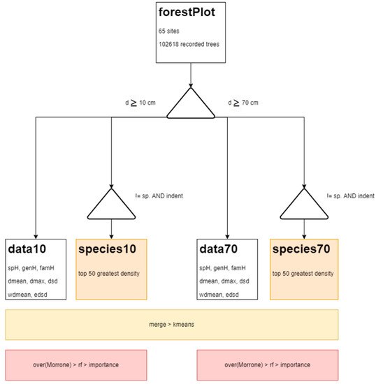 The analysis considered two contexts for the recorded trees: (1) all trees with diameter greater than 10 cm, and (2) only the big trees (diameter greater than 70 cm) (Figure 2). The threshold of 70 cm for diameter was suggested by Harris et al. [3] to define big trees in tropical forests. For both contexts (all trees and big trees), we computed the average of the diversity, richness, and structural attributes for each site. We estimated the forest diversity, characterizing the communities in terms of species, genus, and family composition [24]. Diversity was calculated using the Shannon index (H’). A species accumulation curve was used to compare the theoretical and actual numbers of recorded species [25]. The top 50 abundant species were also retained to describe the sites in terms of relative density. In total, we computed 116 variables (100 of species density, 6 of diversity, and 10 of structure).