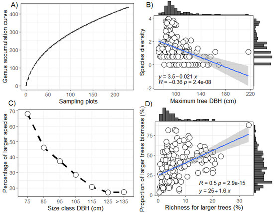 The species accumulation curve, considering all plots, was not stabilized (Figure 3A), indicating that expanding the sampling area would potentially include new species. There was a negative relationship between the diversity of big trees and the maximum diameter (r = −0.36, p < 0.001; Figure 3B). Many species can have individuals reaching 70 cm in diameter. However, with the higher diameter, fewer species were recorded. Only 20% of the big tree species reached classes above 115 cm (Figure 3C). A stronger positive relationship was observed between species richness and the proportion of biomass in big trees (r = 0.5 p < 0.001; Figure 3D), and 75% of the biomass was concentrated in less than 10% of big tree species. The increase in the occurrence of big tree species resulted in a significant increase in total biomass.