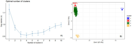 The 116 attributes were computed for each site, considering trees equal to or greater than 10 cm, and a subset of trees equal to or greater than 70 cm. The k-means algorithm and the optimal gap statistic indicated the formation of four groups (Figure 4). The k-means algorithm produced two significant axes that explained 75% of the total variance, separating the sites into four distinct groups. The FEA site formed a single group, strongly influenced by the high diversity and abundance of big trees. An intermediary group had the largest number of sites (n = 59) and split into two other groups on a gradient related to diversity and biomass.
