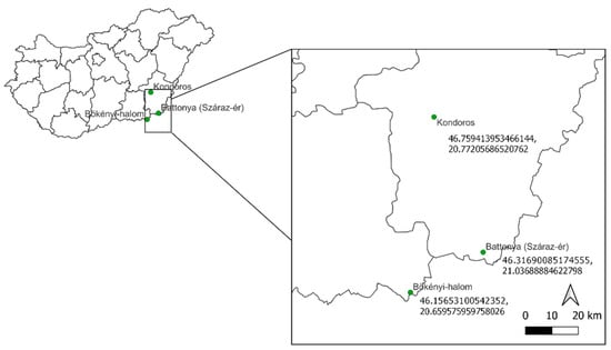 Our surveys were carried out in central lowland area of the Carpathian Basin, in Békés county, beside Kondoros (the area bordered by the connecting roads of Kondoros with Szarvas and Kondoros with Nagyszénás) []. According to the landscape geography classification, the settlement is part of the Békés Plain (Figure 1).