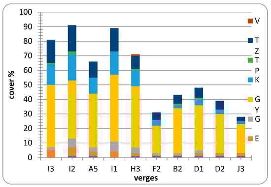 Another verge with good natural condition is the “I”, which is situated along the railway line. This verge is 120 years old; it must be secondary in origin. In contrast, it has the best values for numerous indicators of all the studied verges. It is one of the widest verges, it is an interspaced verge that does not contact the farmland and so is not affected by negative impacts [,]. However, it has been threatened seriously by suspension of railway traffic, as shrub growth has been intensive throughout the verges, similarly to other processes in other areas, which is harmful for grasslands [,,,,,,,].