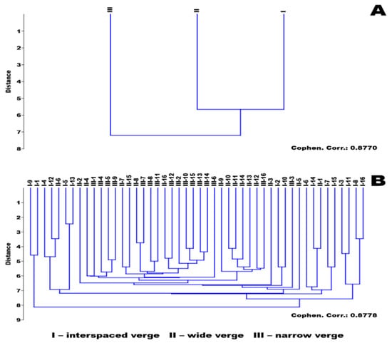 Based on the coenological data, there were two types of verges, which were the interspaced verge and the border verge, but within these there was a wide one (Figure 4A(II)), which was wider than 5 m, and a narrow one, which was narrower than 5 m (Figure 4A(III)). These coenological data were used to generate the classification analysis. In the results, these data were well distinguished (Figure 4A). Data of 14 quadrats of interspaced verges could be characterized clearly, although data of 2 quadrats of interspaced verges can be found in this clade, but their features similar to wide border verge, clade II. Species from clade III were the most uniform.
