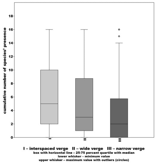 Based on the diversity assessment from the survey, data of the interspaced verge showed the highest diversity value (Figure 5). The least diverse was the data of the type of the narrow verge with the highest number of species in this verge type.