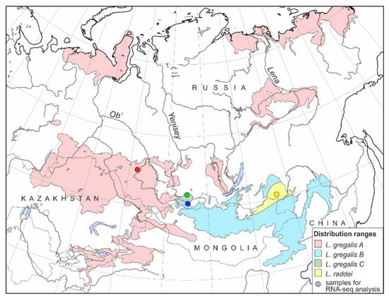 Distribution ranges of L. raddei and three lineages of L. gregalis (according to Batsaikhan et al. [31] with changes). Localities where animals for RNA-seq were sampled are marked with colored circles.