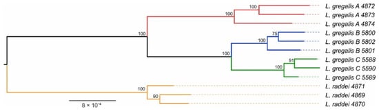 Phylogeny based on the concatenated alignment of 1340 single-copy orthologs with a total length of 1039800 bp was identical to those constructed on the mitochondrial cytochrome b sequences [7] and on a small set of nuclear genes [9]—lineage A L. gregalis being sister to a pair of B and C lineages (Figure 2).