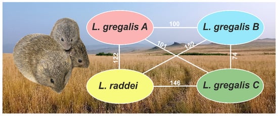 Although only a few hybridization experiments have been performed, no offspring were obtained in any variant when crossing L. raddei with representatives of lineage A (the nominative subspecies of L. gregalis) and lineage C. In various reciprocal combinations of three mt lineages (A, B, and C) of L. gregalis sensu stricto and between the lineage B of L. gregalis and L. raddei, offspring were obtained, but in several combinations compared with the control groups, the fertility and survival of the cubs were decreased [9,10].