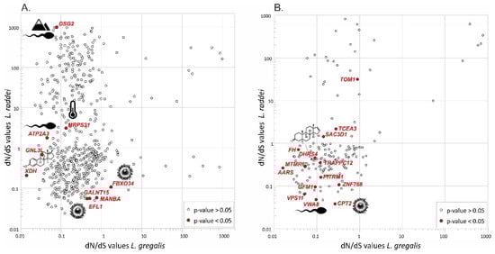 The dN/dS ratio values for individual genes between L. gregalis and L. raddei. (A) Comparison of four assemblies (3 specimens per lineage). (B) Comparison of 12 individual assemblies. Genes with p-value less than 0.05 (before the Bonferroni correction) are highlighted in red. Genes potentially involved in various reproductive processes and associated with adaptations to environmental conditions are marked with corresponding icons.