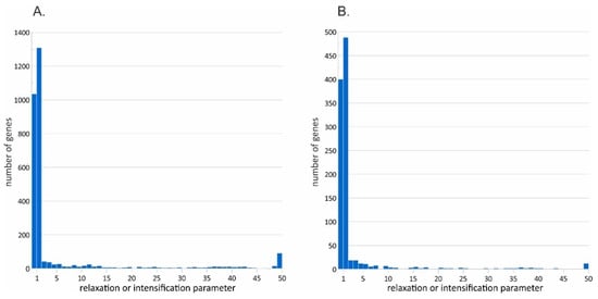 A RELAX analysis showed no significant p-values after the Bonferroni and Holm corrections (Table S5) for both variants of assemblies. A p-value < 0.05 before the multiple testing correction was shown for 53 genes (for pooled assemblies) and for 29 genes (for individual assemblies). The number of genes under the intensification of selection (K > 1) tends to be slightly higher than the number of genes under its relaxation (K < 1) (Figure 5). All revealed genes were involved in the general regulatory and metabolic processes.