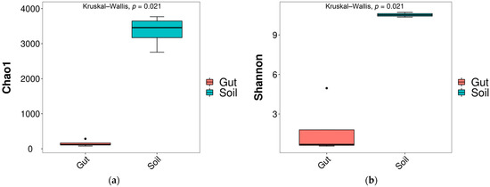 After sequencing, 565,680 raw reads were obtained. There were 565,680 effective reads after filtering raw reads. The richness and diversity of bacterial communities exhibited significant differences between the Gut and Soil groups. The diversity index (Shannon index) and richness index (Chao1 index) decreased significantly (p < 0.05) in the Gut group compared to the Soil group (Figure 1), indicating that the soil bacterial community was more diverse.