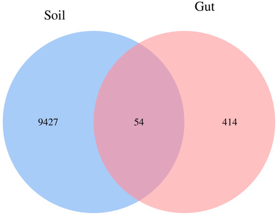 The Venn diagram showed the number of shared and unique ASVs between Soil and Gut groups. The number of unique ASVs in the Gut group and Soil group was 414 and 9427, respectively. The number of shared ASVs was 54 (Figure 2). The small proportion of shared ASVs in the total ASVs of the two groups represented the notable difference in bacterial communities.