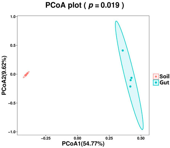 PCoA based on unweighted UniFrac distance was performed to determine the difference in the composition structure between the groups. The PCoA1 and the PCoA2 explained 54.77% and 9.62% of variations, respectively (Figure 3). The result of PCoA showed clear separations into the two groups, representing the difference in bacterial communities. In addition, samples from the same group were clustered together and samples in the Soil group showed higher similarity than those in the Gut group. To statistically support the clustering of the bacterial communities between the two groups, p-value was evaluated via PERMANOVA method. The bacterial community showed significant dissimilarity (p < 0.05) between the two groups.