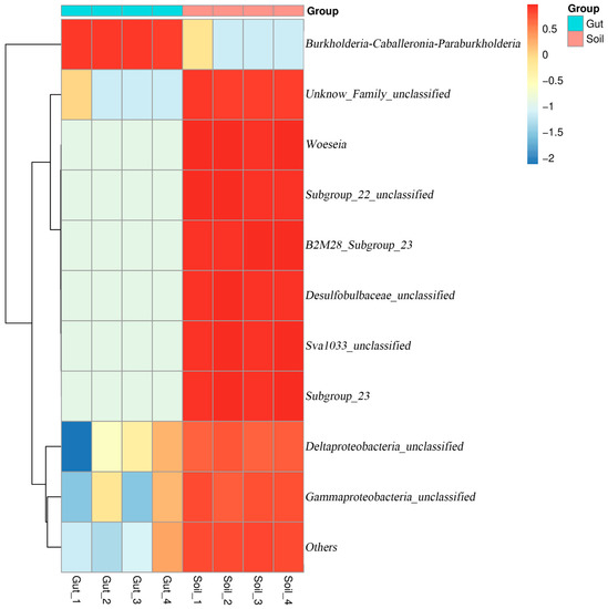 The relative abundance of the bacterial communities at the genus level are shown in Figure 4b. Except for the unclassified genera, the dominant genus (relative abundance more than 1%) in the Gut group was Burkholderia-Caballeronia-Paraburkholderia (86.04%). The dominant genera in the Soil group were Woeseia (5.45%) and Subgroup_23 (2.06%). The heatmap also reflected the distribution of bacteria genera in all samples (Figure 5). These results indicated that there were considerable differences in the bacterial community composition between the Gut group and the Soil group.