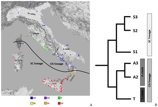 The evolutionary history of P. siculus appears to have been strongly influenced by a series of historical fragmentation events due to severe cycles of glacial/interglacial periods during the Early-Middle Pleistocene with the onset of geographical barriers [,]. These events resulted in a complex phylogeographic structure characterized by strong mitochondrial discontinuities only partially in accordance with the nuclear signature [,]. In particular, there are two main parapatric lineages, corresponding to the “Siculo-Calabrian” (SC) lineage and the “Central-Northern” (CN) lineage (Figure 2). The boundary between these two lineages is settled in central Calabria, although there might be a sympatry area as shown in Figure 2 (see also 28). Within the Siculo-Calabrian lineage, three clades, two in Calabria (S1 and S2) and one in Sicily (S3), were identified, while the central-northern lineage splits into two main clades, the ‘Tyrrhenian’ (T) and the ‘Adriatic’ (A) parapatric clades. The latter can be divided into two subclades (A2 and A3). The T-clade is mainly distributed across the northern-central Tyrrhenian coast, while the A-clade is found along the Adriatic coast and in Croatia and extending in the Tyrrhenian coast in southern Italy (the distribution of mtDNA lineages and clades in Italy is indicated with their phylogeny in Figure 2).