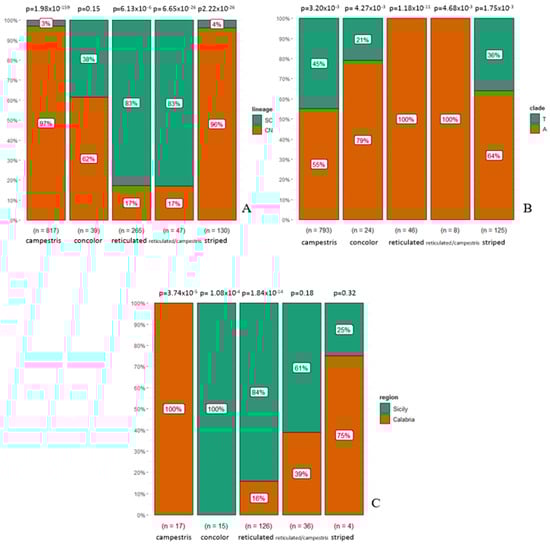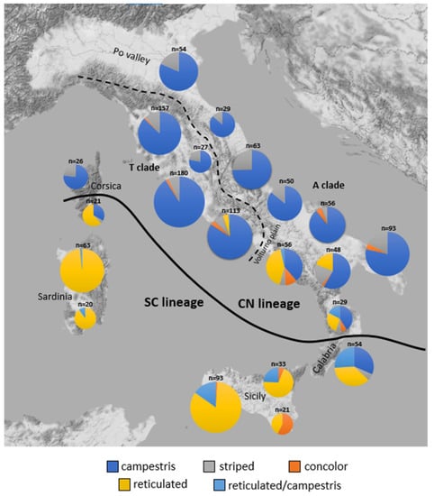 The χ2 test confirmed the presence of statistically significant differences in the frequencies of various DPs between CN and SC lineages. “Campestris” and “striped” are more frequent in the CN lineage, whereas “reticulated” and “reticulated/campestris” are more frequent within the SC lineage and “concolor” showed no association with any lineage (Figure 4). Statistically significant differences were also detected between A and T clades, due to the higher frequencies of reticulated individuals in the latter, and between Calabria (S1 + S2) and Sicily (S3).
