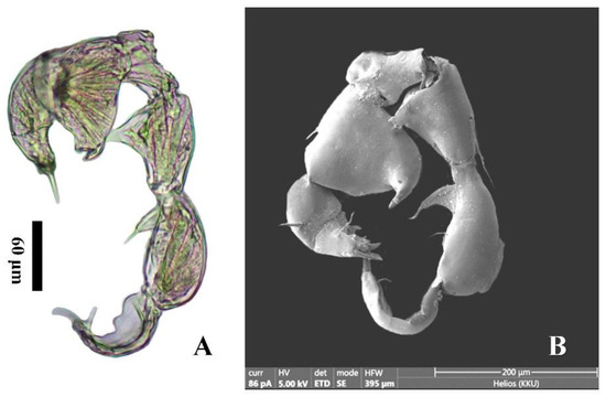 Photographs of the male leg 5 (P5) of a brackish-water calanoid copepod, Acartiella sinensis: pictures taken using a light microscope (A) and a scanning electron microscope (B).