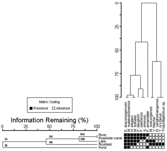 The similarity of the sites is based on the presence of the calanoid copepods. Hierarchical analysis recognized five habitats at a Jaccard similarity distance of 100%. Based on a cluster analysis, there are three groups of habitats: (1) river and roadside canal (IIIA) and lake (IIIB); (2) rice field (IIB); and (3) pond (IB) (Figure 5). The Jaccard’s index revealed a closer relationship between the habitats of river and roadside canal, resulting in a similarity percentage of 98.75%. Seven species (Eodiaptomus draconisignivomi, Mongolodiaptomus malaindosinensis, Heliodiaptomus elegans, M. botulifer, Pseudodiaptomus dauglishi, P. siamensis, and Acartiella sinensis) were found in this group. Group IIIB, consisting only of lakes, showed approximately 81% similarity in species composition to Group IIIA. Group IIB consists only of rice fields, and showed an approximately 46% similarity in species composition to Group IIA, and all diaptomid calanoids (nine species) were found in this group. In contrast, in Group IB, pond habitat was separated from lower species richness. Three species (E. draconisignivomi, M. malaindosinensis, and Pseudodiaptomus annandalei) were found in this group. Based on the diagram of species composition, most of the calanoids were found in both permanent and temporary water habitats. However, Neodiaptomus yangtsekiangensis, Tropodiaptomus oryzanus, and Tropodiaptomus sp. were found only in temporary water habitats, while the three taxa of the genus Pseudodiaptomus and A. sinensis were found only in permanent water habitats.