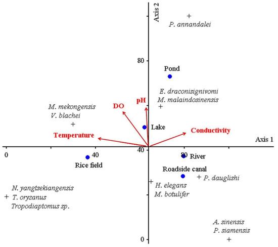 The first two axes of CCA ordination accounted for 85% of the variance in the species data (Table 4). The eigenvalues for axis 1 and axis 2 were 0.430 and 0.207, respectively. The correlation (r-value) between the species and environmental variables for axis 1 and 2 was the same value of 1.000. The percentage of variance explained by axes 1 and 2 was 57.4% and 27.6%, respectively. The Monte Carlo test showed that the environmental variables were significantly correlated (p = 0.036) (Figure 6). Axes 1 and 2 were positively correlated to water temperature, conductivity; and pH and dissolved oxygen, respectively. The CCA divided the collected species into four groups; i.e., Group 1, copepods that are likely to be found in habitats with higher-than-average water temperatures (r = 0.766), dissolved oxygen (r = 0.782), and pH (r = 0.844), were M. mekongensis and Vietodiaptomus blachei. Group 2, copepods that are likely to be found in habitats with lower water temperatures, dissolved oxygen, and pH, were A. sinensis, P. siamensis, P. dauglishi, H. elegans, and M. botulifer. In Group 3, copepods that are likely to be found with higher-than-average conductivities (r = 0.655) were P. annandalei, E. draconisignivomi, and M. malaindosinensis. In contrast, N. yangtsekiangensis, T. oryzanus, and Tropodiaptomus sp. were found in Group 4 copepods with low conductivity.