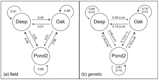 CMR estimates of migration between the three focal ponds were somewhat symmetric (Figure 1a). While emigration from Pond Two was greater (0.06 to either Oak Pond or Deep Pond) than immigration into Pond Two (0.05 from Deep Pond, 0.01 from Oak Pond), the difference was minimal. Migration between Oak Pond and Deep Pond was asymmetric with greater movement into Oak Pond from Deep Pond (0.04) compared to the movement into Deep Pond from Oak Pond (0.01). Overall, the lowest migration was of individuals leaving Oak Pond (0.01), while Pond Two had the highest proportion of non-migrants (0.91).