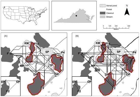 Our study focuses on three breeding ponds of Ambystoma opacum that are in the Maple Flats Sinkhole Pond Complex [] at the base of the Blue Ridge Mountains in the Shenandoah Valley of Augusta County, Virginia, USA, which is home to approximately 24 ponds (Figure 1). We focused on three ponds (Pond Two, Oak Pond, and Deep Pond). These focal ponds are part of a karst-depression wetland in the Shenandoah Valley [] with little microtopography among ponds and are well-known for their role in biodiversity and biogeographic patterns of organisms. The three differ in the extent of regenerating forest (clear cut in 1980) and mature forest (at least 100 years old) that encircle each pond []. Within the clear cuts, white pines were planted at higher density than they occur within the mature forest. Regenerating forest is situated between Deep Pond and Pond Two and between Deep Pond and Oak Pond. The ponds represent breeding grounds for terrestrial adults, who breed explosively from late August through September. Marbled salamanders lay their eggs in dry or ebbed ponds and the eggs hatch when rising pond levels inundate the nest [,]. Breeding site fidelity is high among experienced adults []. Marbled salamanders retreat from their breeding ponds during the nonbreeding season or in the case of brooding females after a nest is inundated. They live primarily underground the remainder of the year, with limited movement [].